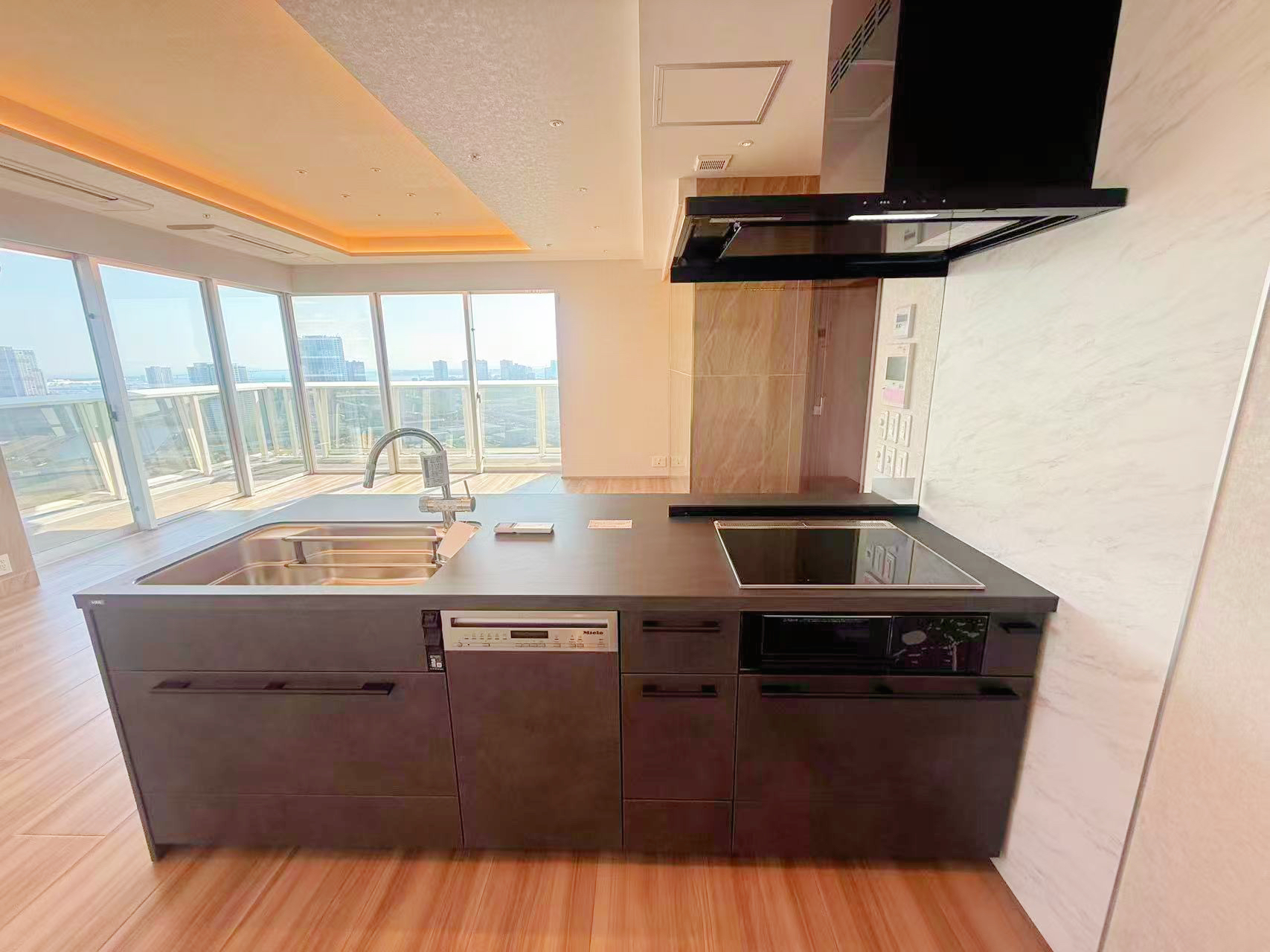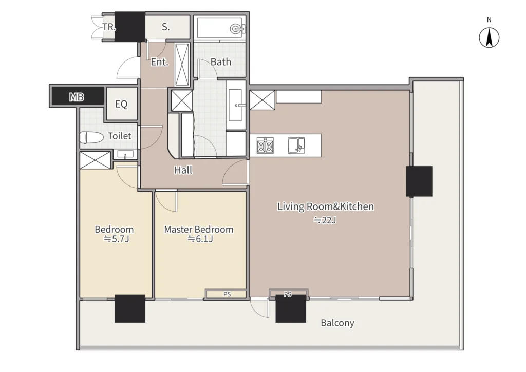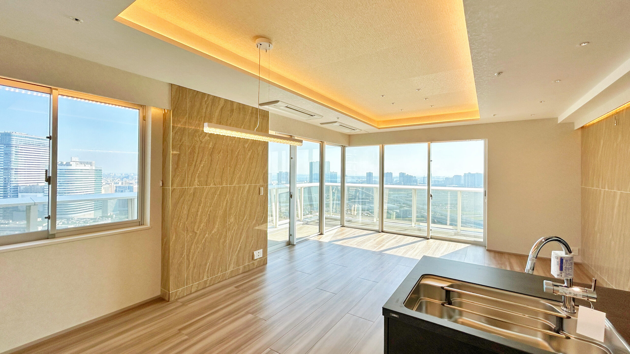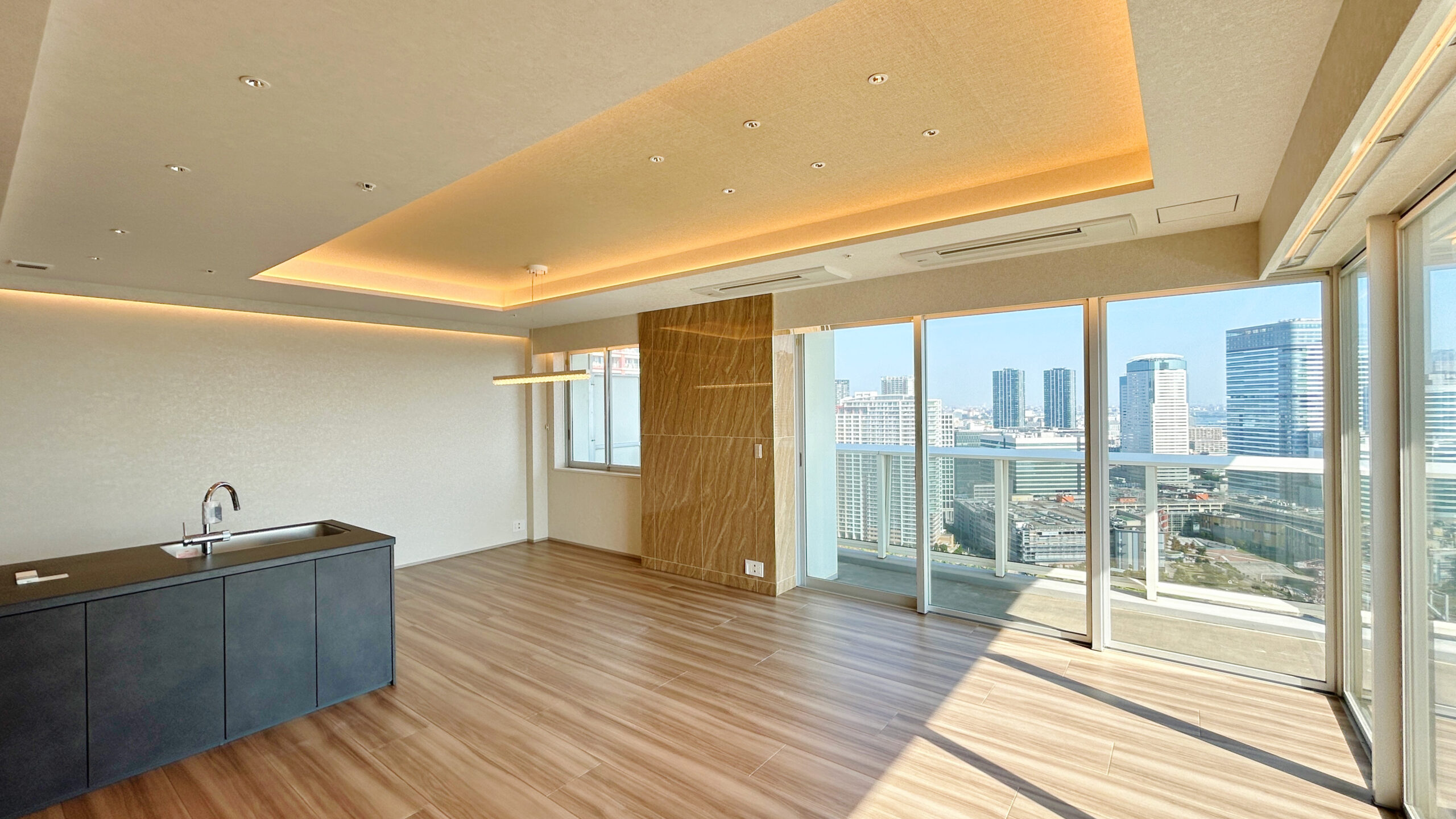 住まいの中心となるLDK(リビング・ダイニング・キッチン)は、圧倒的な開放感と温もりに満ちた空間。家族の絆を育むオープンキッチンには、会話が弾むカウンターを設えました。 南向きに配された2つのベッドルームは、究極の安らぎを約束します。バルコニーのダイナミックな掃き出し窓は、刻一刻と表情を変える都会のパノラマを日常の風景へと変え、パブリックとプライベートを峻別した間取りが、日常の質をさらなる高みへと引き上げます。